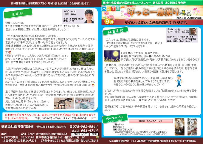 04日 9月 2025 西神住宅設備 ニュースレター 2025年9月発行 第133号 神戸市西区の西神中央(西神ニュータウン)を中心に住宅の修理とリフォームを行っております家族経営の小さな会社のお客様に毎月お送りするニュースレターです。 次号へ進む ホームへ 前号へ戻る tagPlaceholderカテゴリ: コメントをお書きください コメント: 0